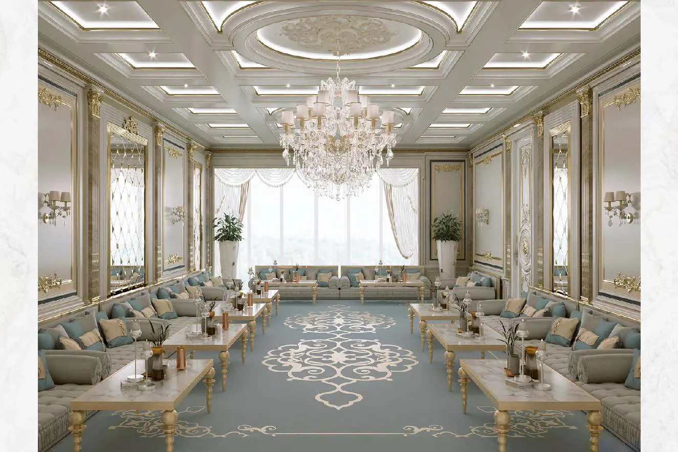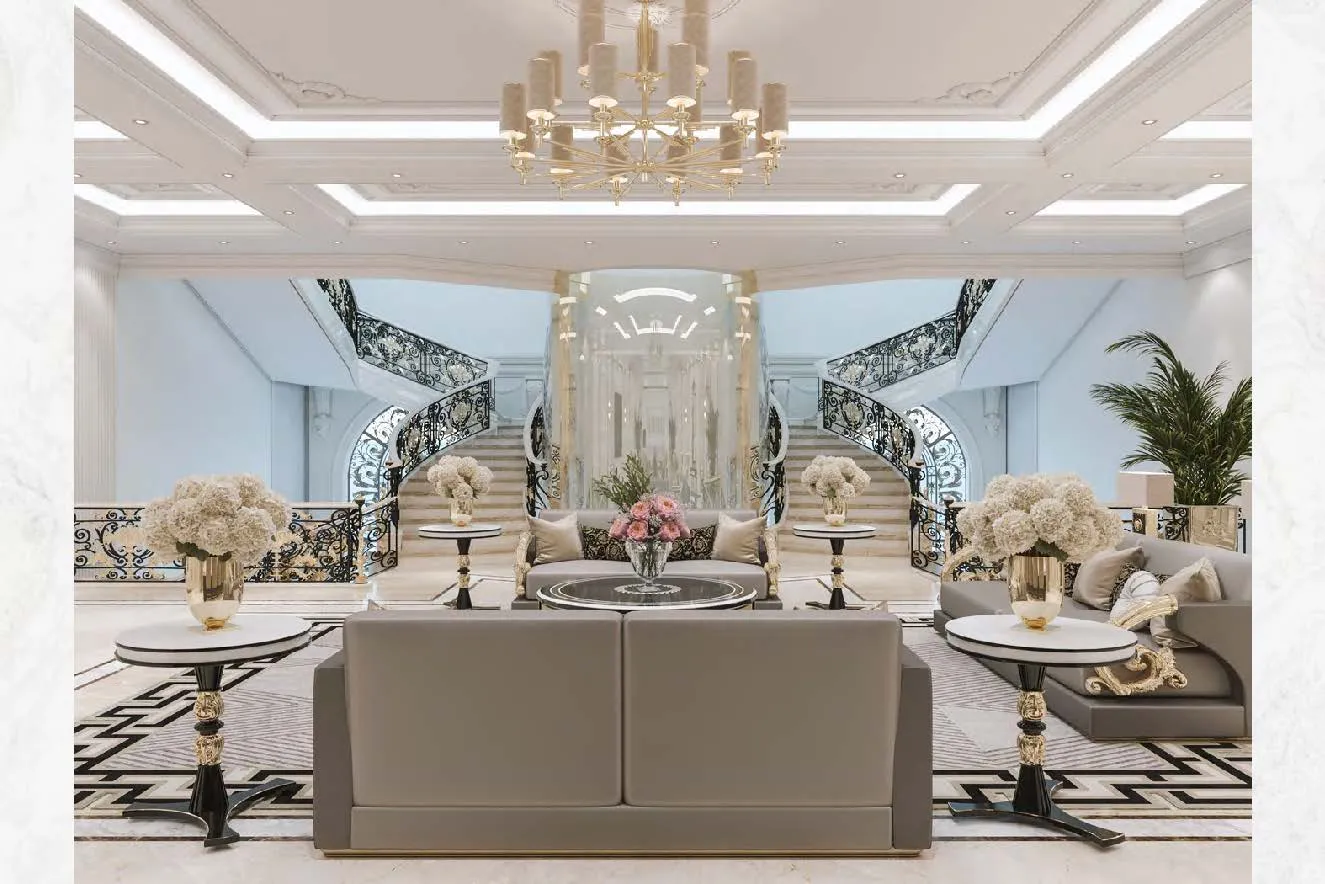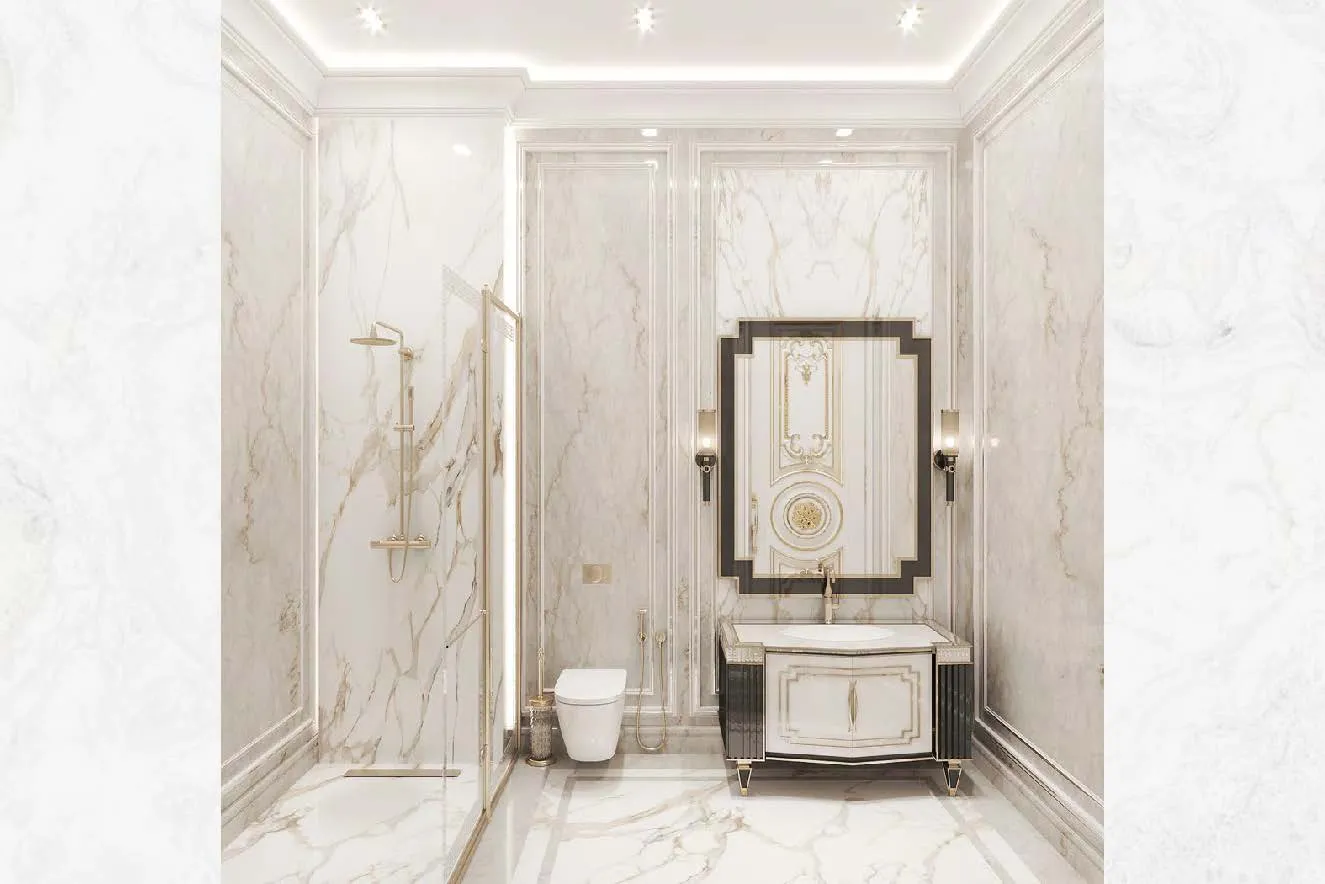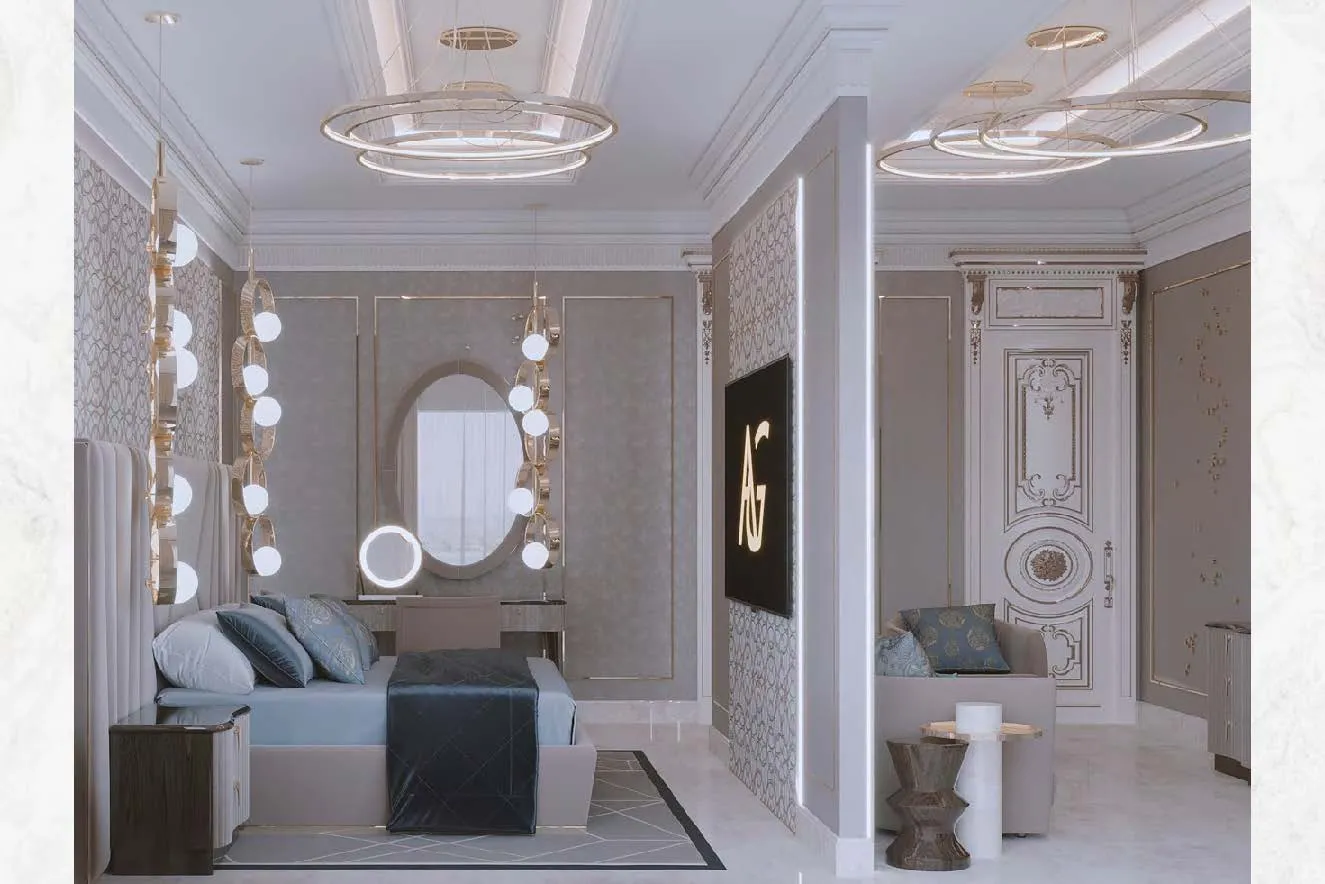 A spacious room with a big window, offering a serene view.A stylish bedroom with a sleek marble wall, creating a contemporary and elegant ambiance.